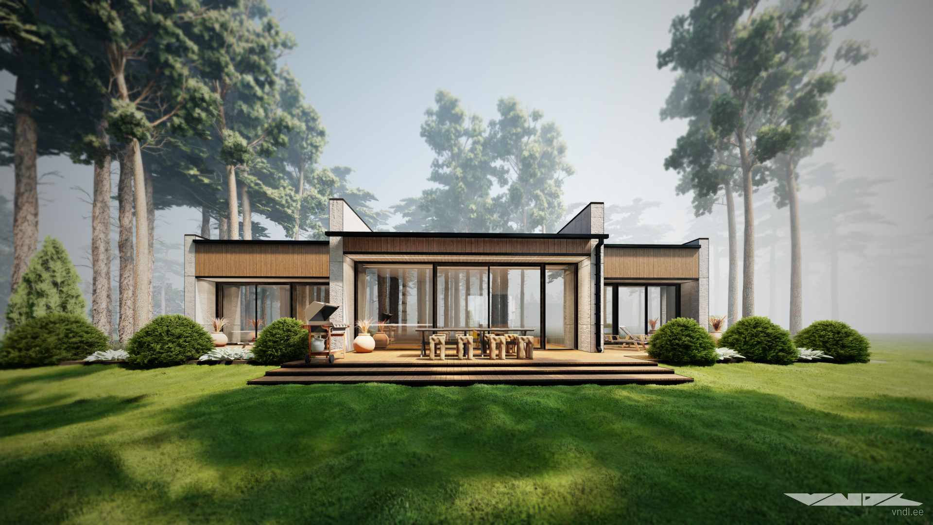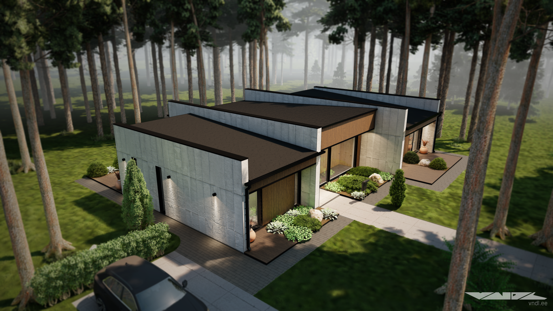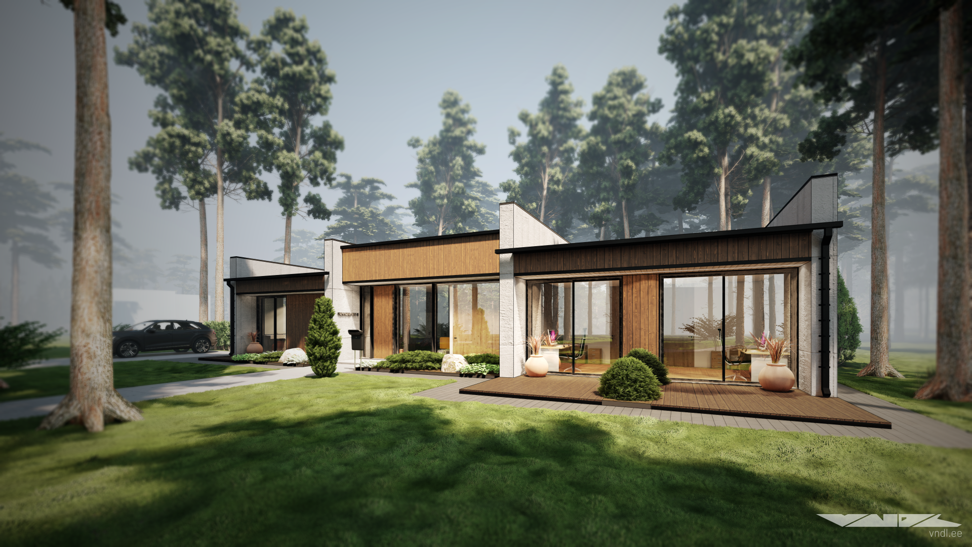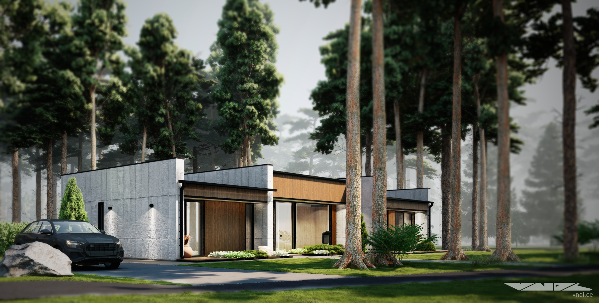 The house is situated along the northern edge of the property, close to the street, making it possible to preserve much of the existing forest and to enjoy beautiful views across the rest of the plot from the living areas. In front of the home, you’ll find a simple, clean lawn and a dedicated parking area.