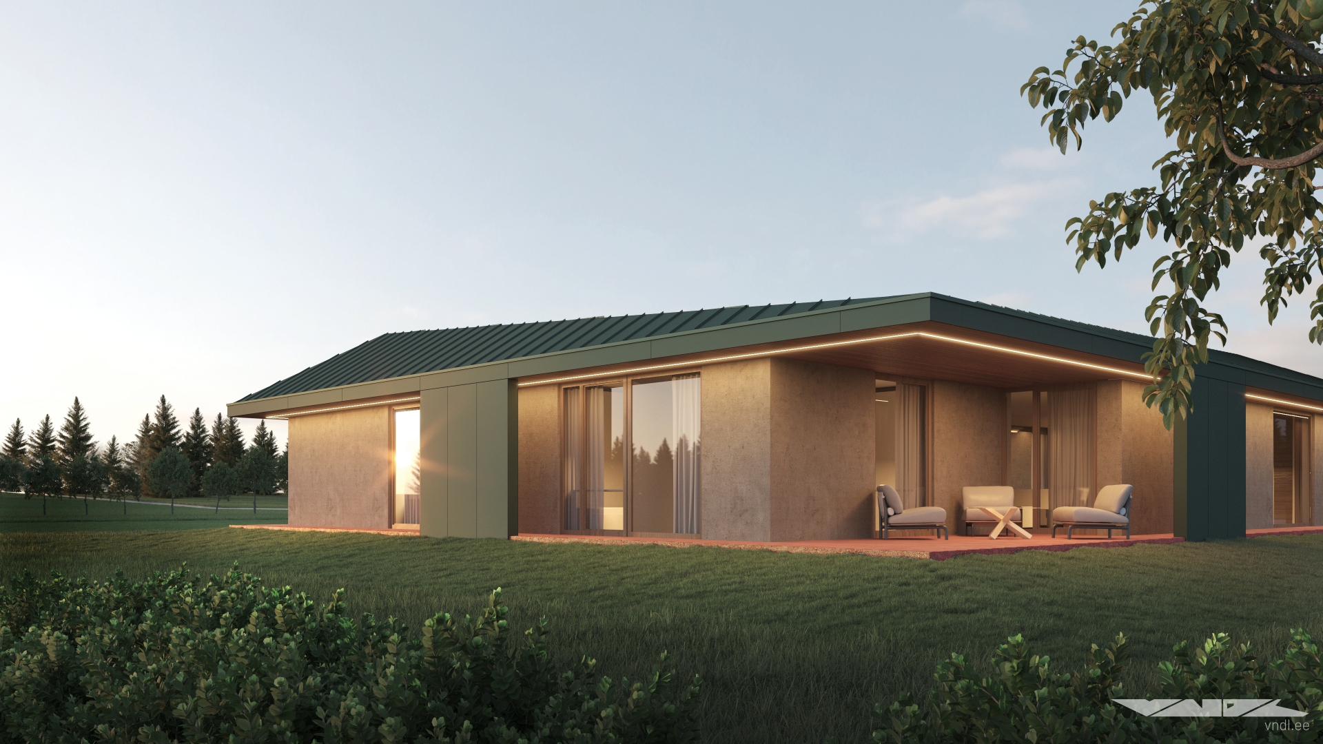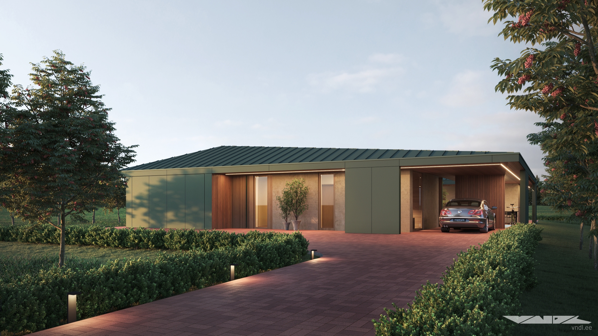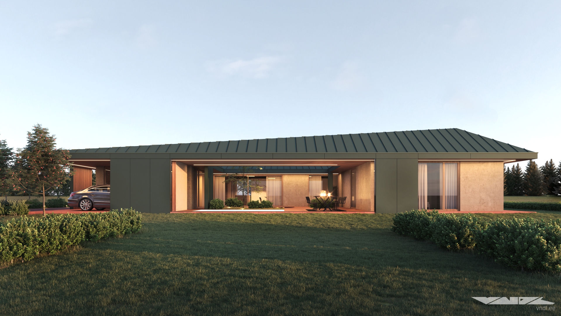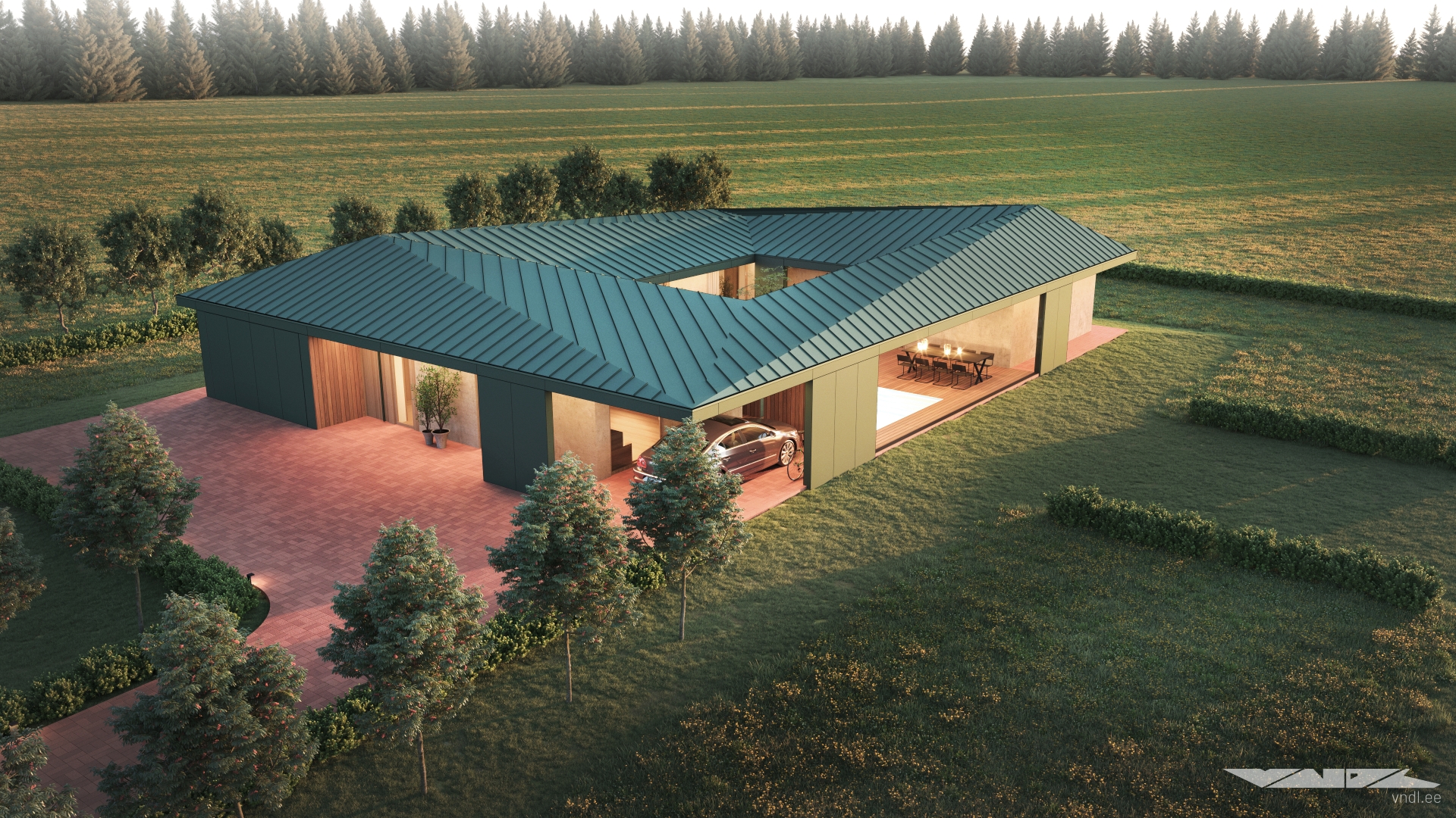 The plot located in Soinaste village, near Tartu, is a spacious meadow, independent from the already established single-family residential areas. The property is undeveloped, and there is no significant vegetation, which allows for long views in every direction. The large plot is conceptually divided in half, with the proposed building located in the eastern part of the plot, while the western side is occupied by a reduced-size football field. Due to the need to create a private and wind-protected outdoor space, the design of the building volume clusters around a central courtyard. The house has a minimalist yet strong architectural language, with the main design element being the multifaceted roofscape. The single-story linear form and the raised terrain around it relate to the surrounding laconic context. The driveway is lined with a row of rowan trees.