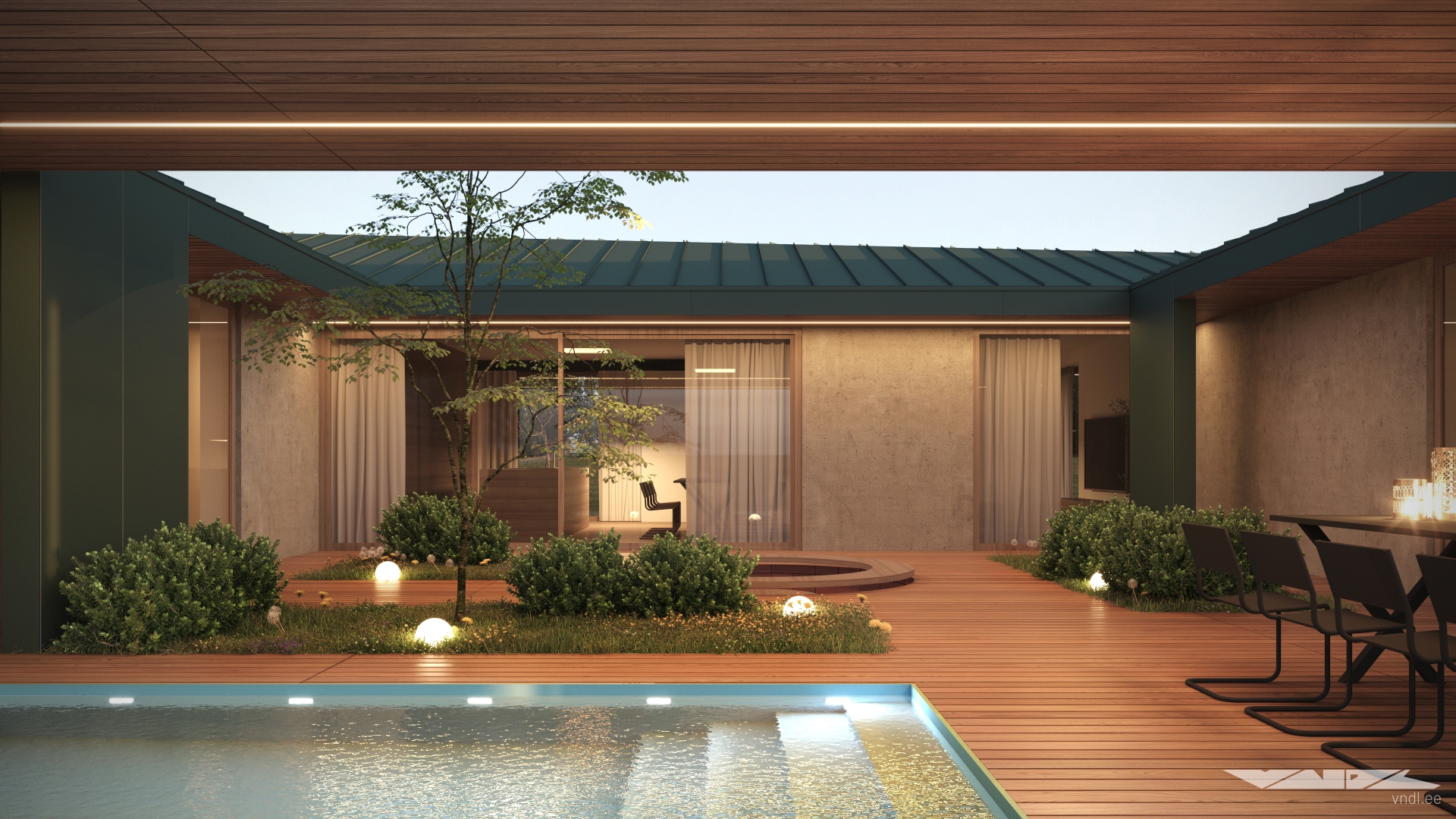 The street-facing facade is both representative and private. Parking is available under a carport or in the garage. The northern part of the U-shaped floor plan contains the main entrance, a spacious wardrobe, a garage with a utility room, and a sauna complex, which also opens to the courtyard terrace. In the center of the building, an elongated living room is designed, with an open kitchen and dining area. Moving through the living room, one reaches the more private part of the house with 3 bedrooms, bathroom and a home office. In the center of the courtyard, which is open to the evening sun, there is a fire pit with a circular bench and an outdoor pool. The terrace can be closed with sliding glass panels.